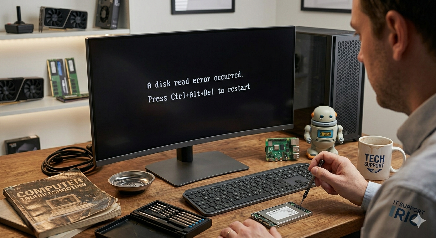 Imagine a seguinte situação: você aperta o botão para ligar o seu computador, esperando ver suas fotos ou o seu trabalho, mas, de repente, surge uma tela preta com letras brancas dizendo “A disk read error occurred” (um erro de leitura de disco ocorreu).