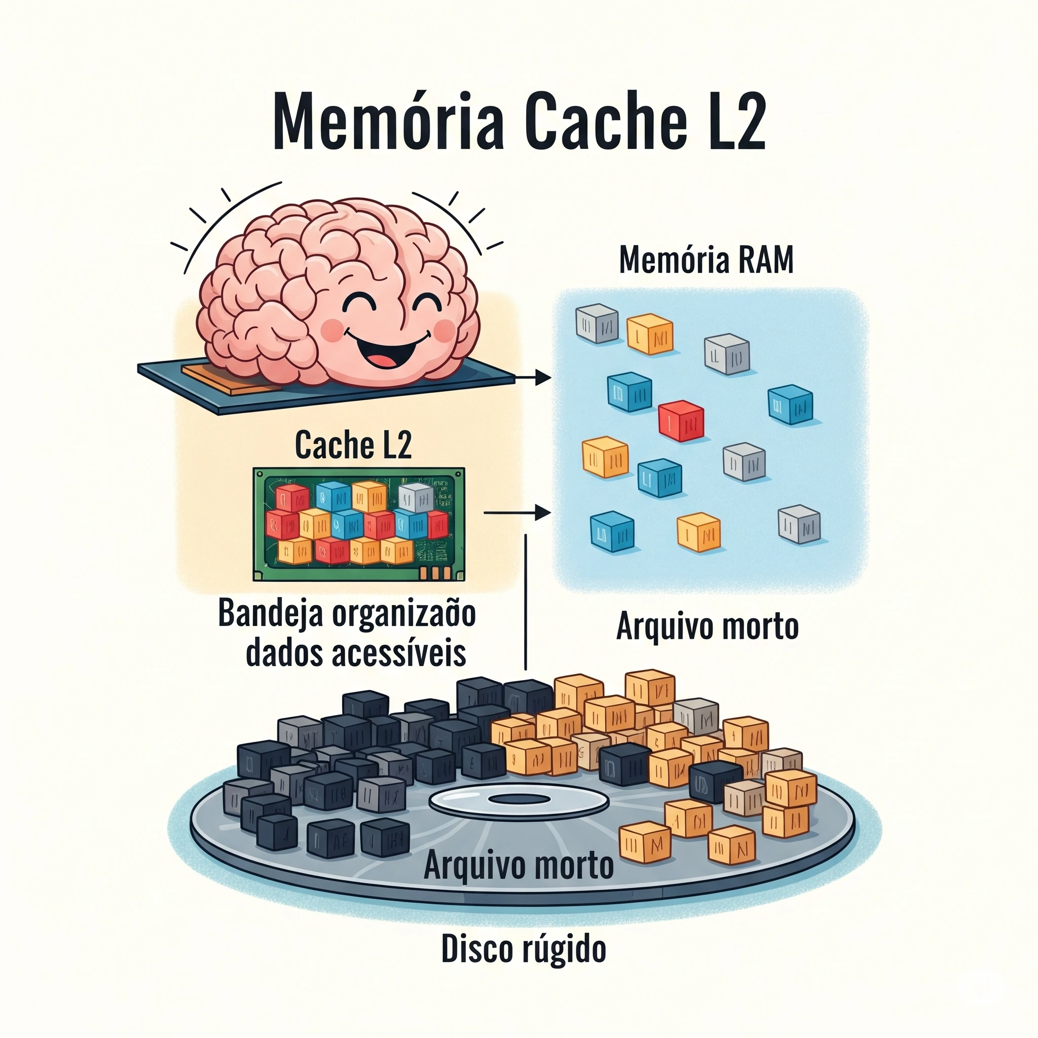 • Pense no L1 como um chef pessoal que já tem na mão os ingredientes que o cozinheiro (Processador) vai usar neste exato segundo. Ele é tão rápido que a informação chega quase que instantaneamente.