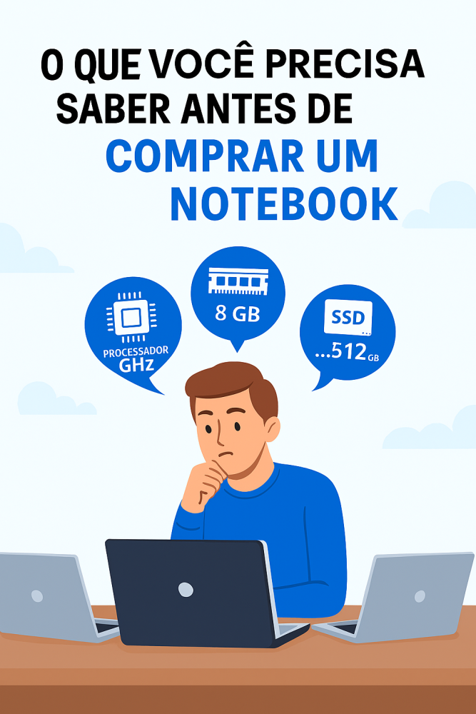 Antes de comprar um notebook, avalie bem o processador e sua velocidade (GHz), pois isso define o desempenho. Considere também memória RAM (mínimo 8 GB), armazenamento SSD (512 GB ou mais) e o sistema operacional correto. Esses cuidados simples evitam dores de cabeça e garantem um equipamento rápido e eficiente.