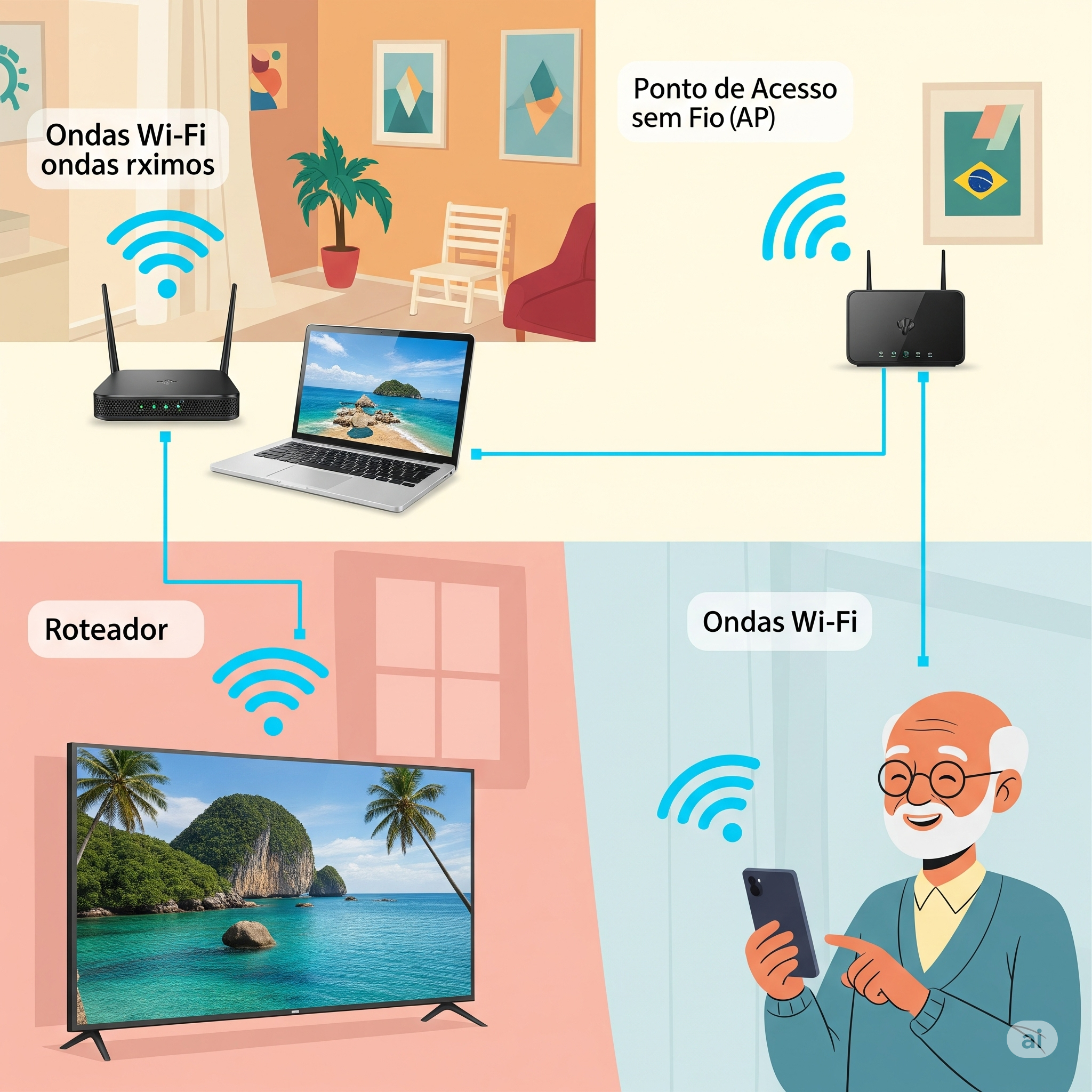 Pense no João, que mora em um sobrado no Rio de Janeiro. No primeiro andar, onde fica a sala e a cozinha, o Wi-Fi do roteador funciona bem. Mas no segundo andar, onde ficam os quartos, o sinal é fraco e a internet vive caindo. A solução ideal para o João seria instalar um ponto de acesso sem fio no segundo andar, conectado por cabo ao roteador lá embaixo. Assim, ele teria um Wi-Fi forte e estável em todos os cômodos da casa, sem precisar trocar seu roteador principal.