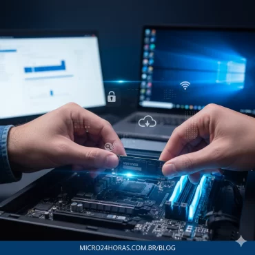 O artigo detalha a configuração de um novo SSD no cenário brasileiro, abordando a instalação física, o reconhecimento no BIOS/UEFI (modo AHCI) e a inicialização no Gerenciamento de Disco do Windows (partição GPT, formatação NTFS). Cobre os passos para uso como unidade secundária (dados) e principal (SO – clonagem ou instalação limpa), enfatizando otimizações como TRIM e a ativação do BitLocker para segurança em ambientes corporativos.