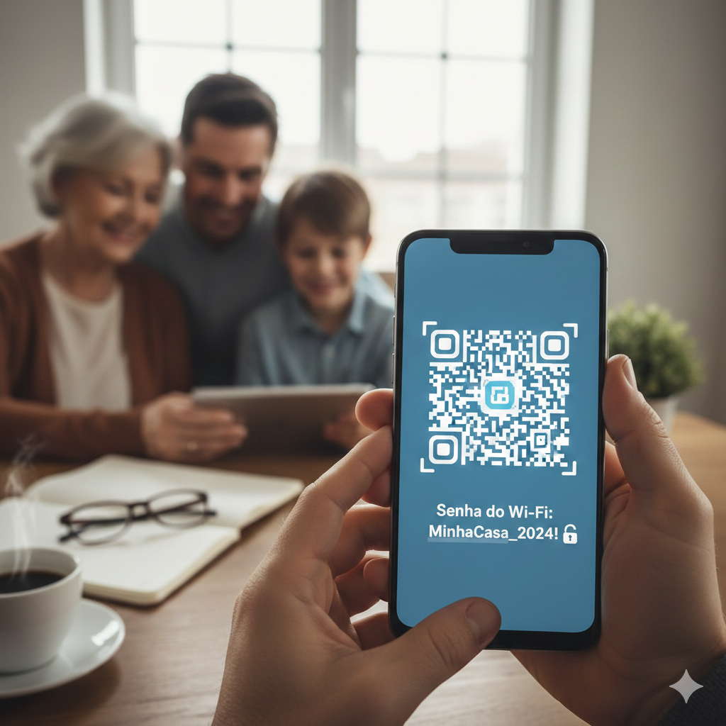 A Senha aparecerá: Abaixo do desenho do quadrado (QR Code), o Android geralmente escreve “Senha do Wi-Fi: [Sua Senha]”. Se não aparecer, você pode tirar um print e usar o Google Lens para ler o código, mas a maioria dos aparelhos atuais já mostra o texto logo abaixo.