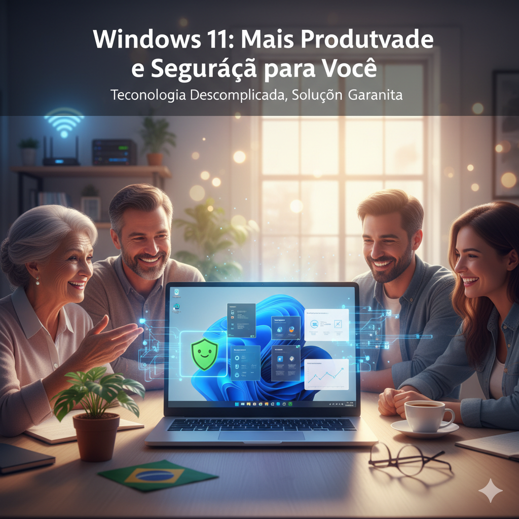 Imagine a internet como uma grande cidade. A cada dia, surgem novos perigos, como vírus e golpes. O Windows 11 foi criado como uma casa mais forte dentro dessa cidade, com trancas e alarmes mais modernos para proteger suas informações pessoais e bancárias. Além disso, ele organiza as janelas e arquivos de um jeito mais inteligente, para você não perder tempo procurando nada.
